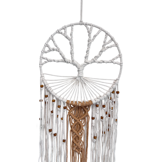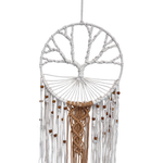 Porta equilibrio e bellezza nei tuoi spazi con questo suggestivo acchiappasogni bianco con Albero della Vita intrecciato a mano. Realizzato in corda di cotone e perline di legno, è un simbolo di crescita, radicamento e connessione con la natura.